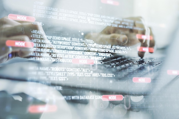 Multi eksposur hologram bahasa pemrograman abstrak dengan tangan mengetik di keyboard komputer dengan latar belakang konsep kecerdasan buatan dan pembelajaran mesin