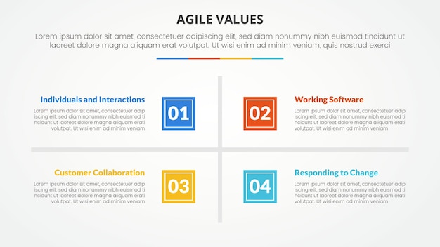 Konsep infografis nilai-nilai gesit untuk presentasi slide dengan kotak persegi kreatif dan garis bawah dengan daftar 4 poin dengan gaya datar