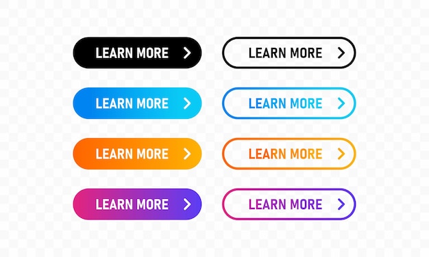 Koleksi Tombol Pelajari Lebih Lanjut. Tombol datar dengan gradien warna-warni. Tombol warna-warni untuk situs dan aplikasi. Ilustrasi vektor.