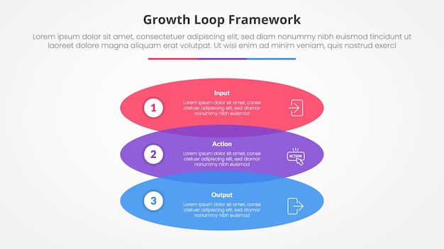 Konsep infografis kerangka kerja lingkaran pertumbuhan untuk presentasi slide dengan bentuk persegi panjang lingkaran venn tumpukan vertikal dengan daftar 3 poin dengan gaya datar