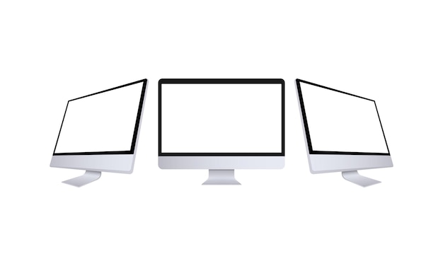 Realistic computer monitor in front and side view. Metal desktop mockup with white screen. Template of computer in silver color. Different view of desktop pc. Vector eps 10.